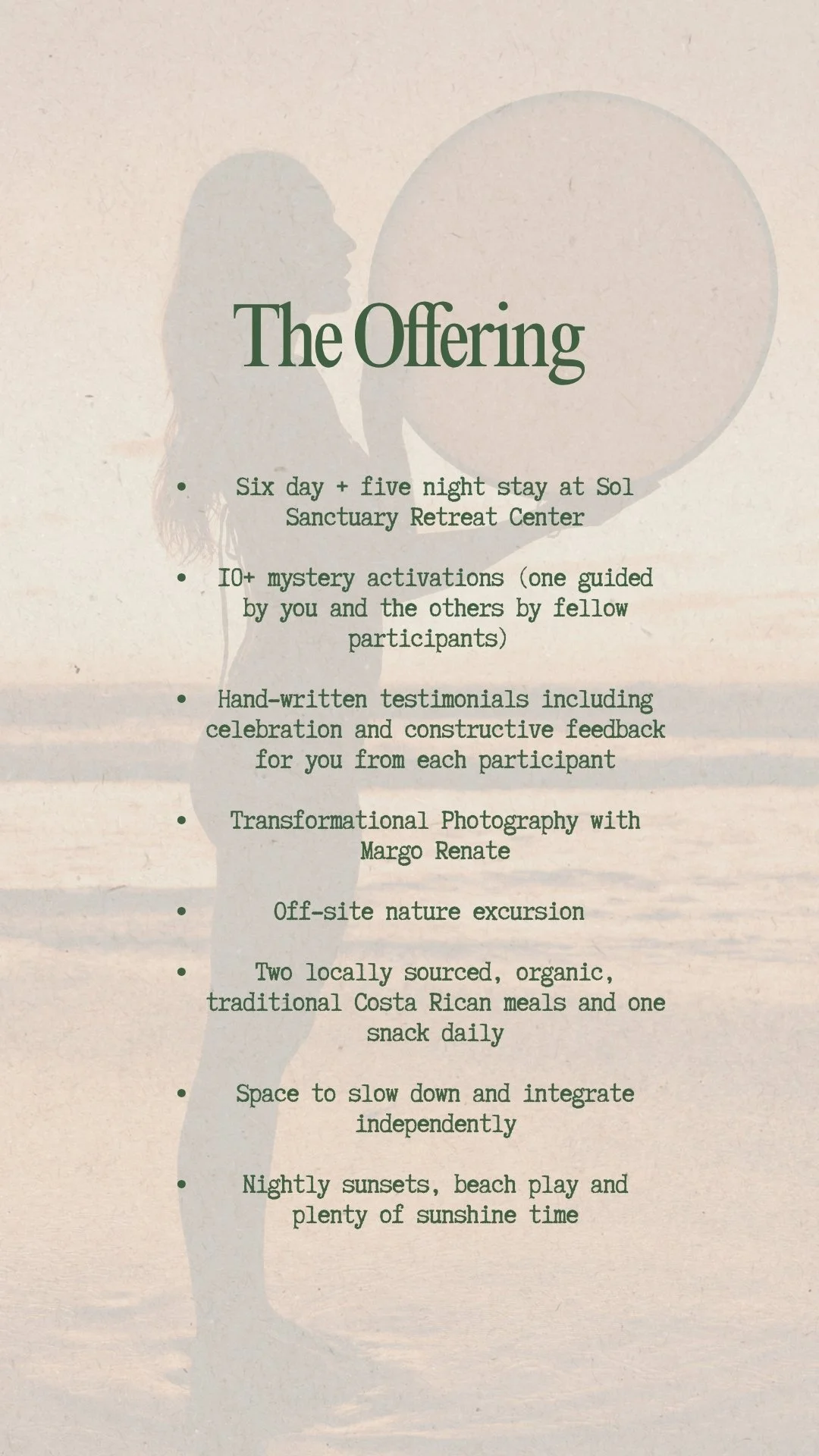 Circle is a 5 night, 6 day mystery immersion for facilitators, space holders and healers in Playa Grande, Costa Rica. Every single participant (10-15 total) will also be guiding/teaching a class, workshop or activation. As a participant, you will fill out a conscious feedback and testimonial form for each facilitator and you will receive the same for yourself from the other participants.